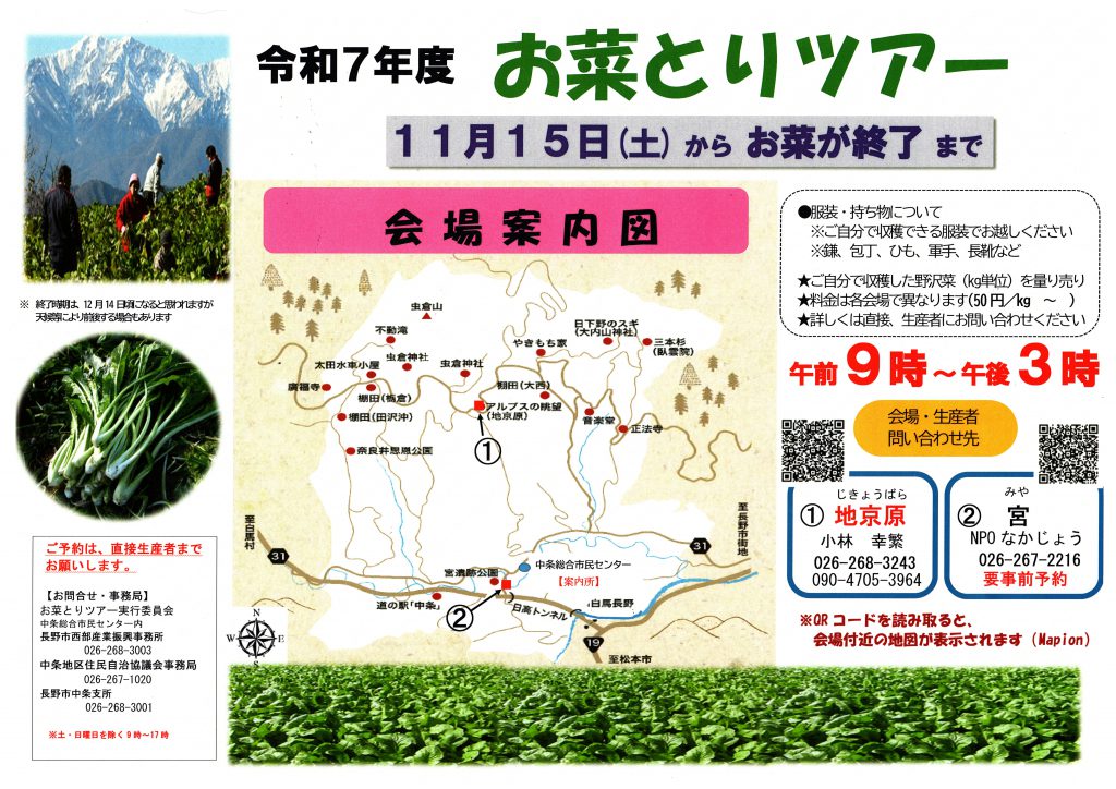 中条地区の秋の恒例イベント「お菜とりツアー」が今年も11月15日(土)から始まります。今年も良いお菜が沢山育っています。大勢の皆様のご来場をお待ちしております。