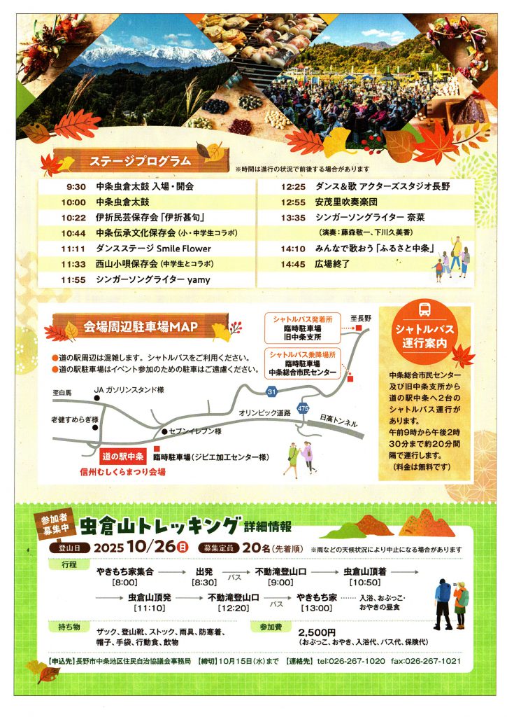 11月3日(月・祝)に道の駅中条ふるさと広場を会場に第19回信州むしくらまつりを開催します。また、これに先立ち10月26日(日)には虫倉山トレッキングを行います。詳しい内容等につきましてはチラシをご覧ください。大勢の皆様のご参加を心からお待ちしております。