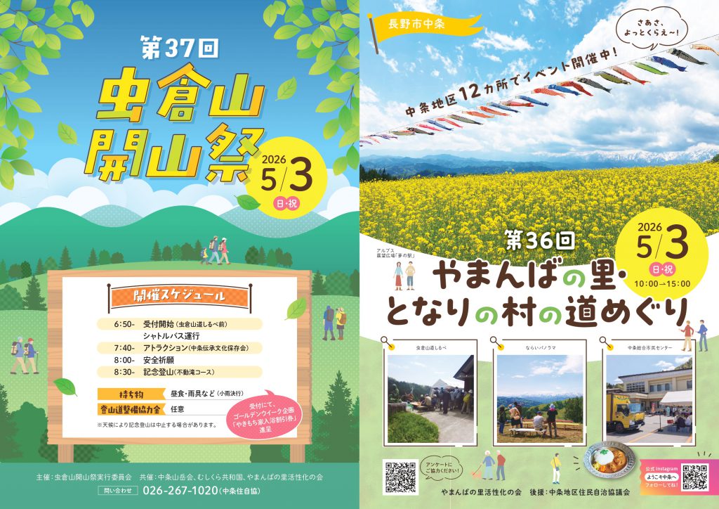 中条地区の春の恒例イベント「虫倉山開山祭」「となりの村の道めぐり」が今年も5月3日(土)に開催されます。アルプス展望広場の菜の花は見頃となっています。また、菜の花畑のこいのぼりは4月26日に地元の皆様が設置する予定です。実行委員会一同皆様のご来場を心からお待ちしております。詳しくはパンフレットをご覧ください。(クリックするとPDFが開きます)